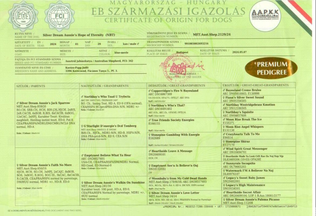 4x Junior Best in Show, 3x Res. Junior Best in Show, 2x Best in Show, 2x Res. Best in Show, 2nd place in Junior class at EDS 25’, 6x Junior CACIB, 8x Best Junior, 7x BOB, 6x Junior Best of Group 1., 4x Best of Group, 3x Res. Best of Group Junior Champion of Hungary, Junior Champion of Bosnia and Herzegovina, Junior C.I.B, 2x Minor Puppy Best in Show, 4x Res. Minor Puppy Best in Show, Minor Puppy Best in Show 3., Puppy Best in Show 2., Puppy Best in Show 3.